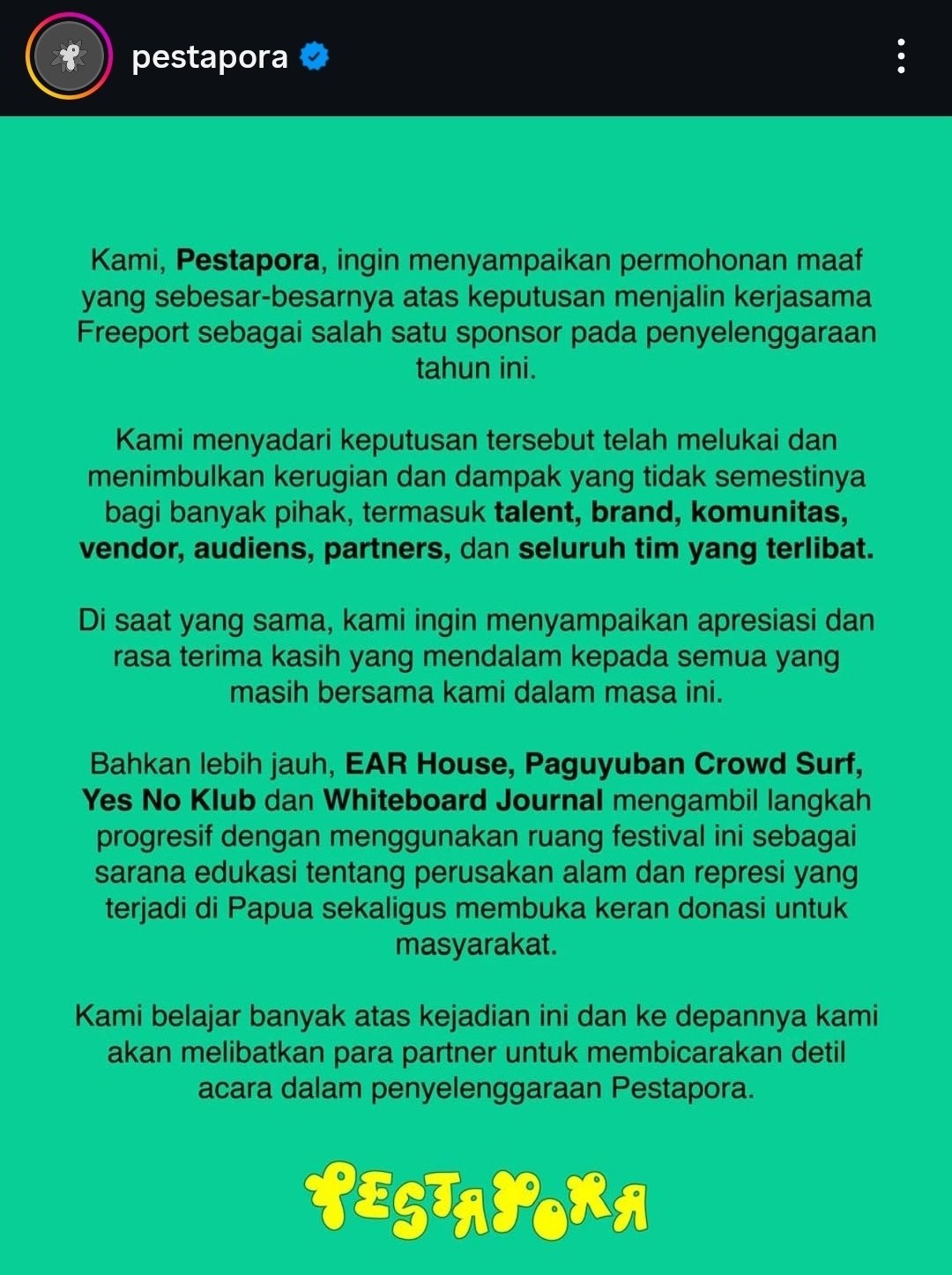 Lewat unggahan di akun Instagram resminya, pihak Pestapora menyampaikan permintaan maaf sekaligus penyesalan atas keputusan menerima Freeport sebagai sponsor. Mereka mengakui langkah tersebut telah melukai banyak pihak, mulai dari musisi, komunitas, vendor, hingga penonton.