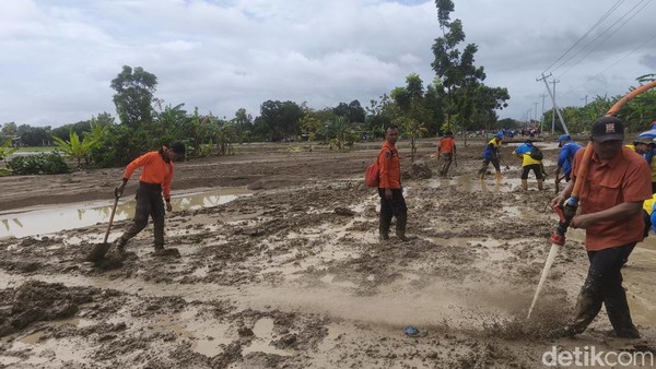Pembersihan Jalan Semarang-Purwodadi yang terkena lumpur jebolan tanggul Sungai Tuntang, Kecamatan Kebonagung, Kabupaten Demak, Selasa (17/2/2026). (Foto: Ardian Dwi Kurnia/detikJateng)